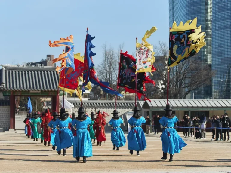 El sol ilumina la explanada frente a Gwanghwamun. Bajo sus rayos, los guardias vestidos con ropajes escarlata y azul marchan