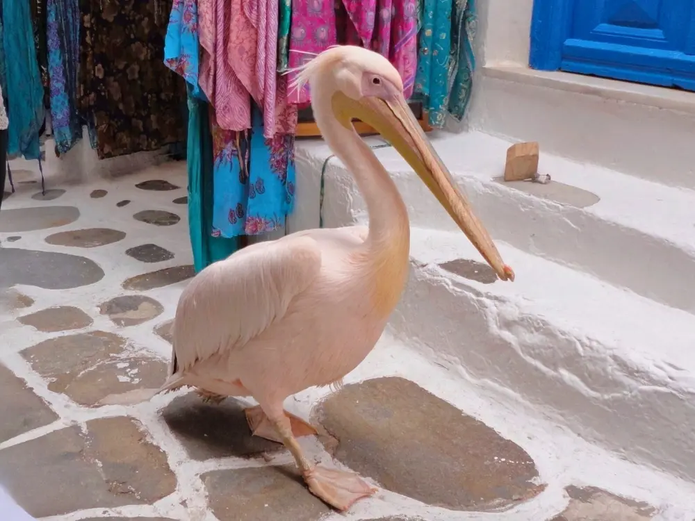 Entre casas encaladas y ventanas azules, apareció el pelícano como un vecino más. Caminaba lento, indiferente a las cámaras y a las risas, como si toda la isla fuera suya. Nadie lo interrumpía: sabían que era parte del alma de Mykonos, tan esencial como el mar que la rodea.