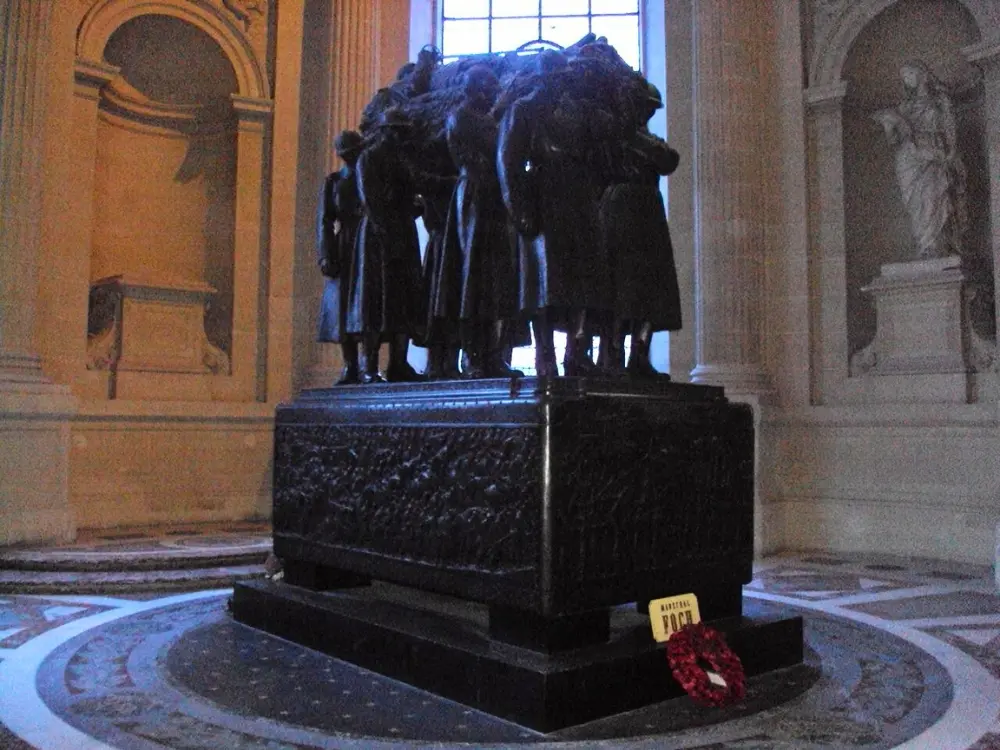 Unas figuras de bronce caminan sobre la tumba de Foch, hombro con hombro, eternamente erguidas.